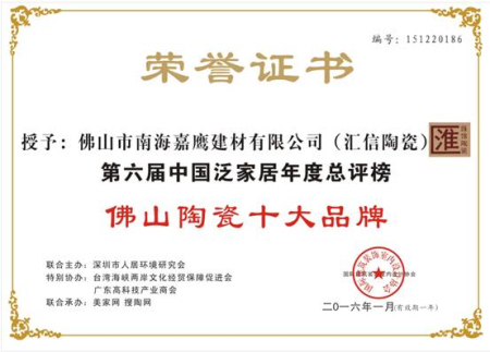 作為一家擁有強勁實力和獨到的生產理念的陶瓷企業,匯信陶瓷一直堅持著“質量第一,顧客至上”的經營信念,本著“互惠互利、共同發展”的原則,在企業的發展道路上不斷開發創新,不斷突破自我。在“第四屆中國泛家居領袖品牌論壇暨第六屆中國泛家居十大品牌總評榜”活動上,匯信陶瓷榮獲“佛山陶瓷十大品牌”稱號,同時也獲得了業內的一致認可。