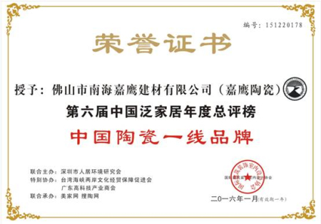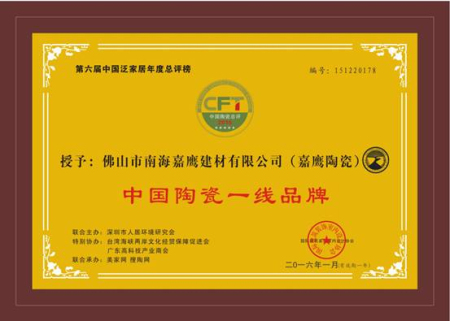 2016年對于嘉鷹陶瓷來說是注定不平凡的一年。在2016年的開端,嘉鷹陶瓷就打響新年第一炮,一舉獲得了“中國陶瓷一線品牌”稱號。