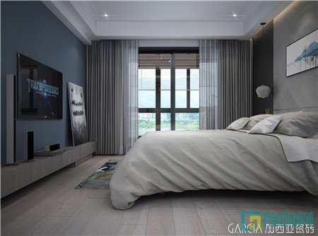 臥室的地磚大熱無疑是木紋磚,也是與黑武士系列的最佳搭配!柔和的原木質(zhì)感,它為空間所帶來的溫馨感,似乎已經(jīng)難以被取替。淺棕色的軟裝搭配,有種讓人無法抗拒的依賴感,進入臥室,身心早已墜入其中,無法抽身,感受這軟綿綿的舒適感。而電視背景墻,偏偏在這種單調(diào)的空間里,以素雅暗沉的藍色,帶來一絲靈動的活力。