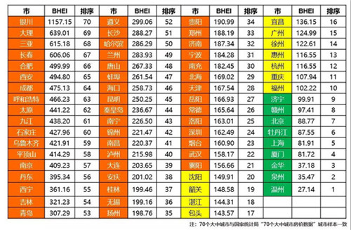2019年全國70個大中城市BHEI排序