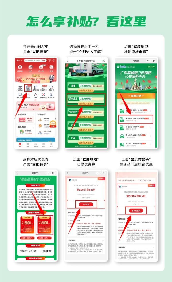 打開云閃付App首頁——以舊換新——粵煥新:家裝廚衛(wèi)——家裝廚衛(wèi)補(bǔ)貼申請——立即領(lǐng)券。