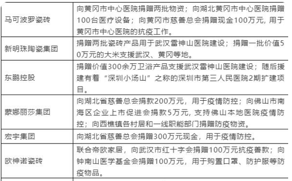 經過實踐證明,一個企業如果以實際行動回報社會,在市場競爭中自覺承擔相應的社會責任,會得到國家各級部門的支持,也會使企業非常容易在公眾中獲得高信任度和知名度。這對企業的品牌來講是一筆無形的巨額資產,會讓品牌產生更大的魅力,對消費者具有更大的吸引力。2020年全國疫情爆發,其中湖北是當時疫情最嚴重的地方,正所謂“一方有難,八方支援”,佛山陶瓷行業的眾多愛心企業也是第一時間火速支援抗疫前線。前線缺什么,他們便送什么,實實在在地反哺社會。