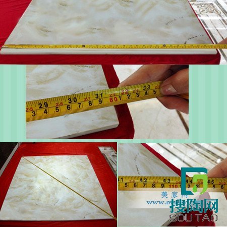 瓷磚的尺寸誤差直接影響到整體鋪貼效果。金絲玉瑪瓷磚銀河之星系列磚體平整,邊角切割整齊。工作人員用卷尺測量磚體長寬以及對角線,該款瓷磚的官方規格是800*800mm,經來回嚴密測量,磚體符合要求,尺寸誤差極小。說明金絲玉瑪瓷磚基本規格符合要求,瓷磚鋪貼后整體一致性與人體視覺效果保持最佳狀態。