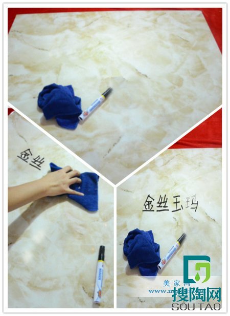 工作人員用黑色筆在金玉名家瓷磚表面書寫“金絲玉瑪”四字。靜置5分鐘后,用抹布輕擦立即去除字樣,瓷磚表面亮潔如新。說明金絲玉瑪瓷磚抗污性強,易于清潔。大大減少消費者在家居清潔環節上的煩惱。