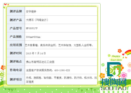 總結: 綜合以上各項測試,給小編的感覺是安華大理石瓷磚“瑪瑙金沙”外觀高端大氣,不僅適用于商業空間、家庭裝飾等,更適用于公共區域,餐廳的裝修設計中。同時,該款瓷磚的技術含量相對較高,具有極強的耐磨性,且兼具了防水、防滑、抗壓等的特性,在實際應用中不易被劃傷。瓷磚本身花色易于搭配組合,表面易于清潔打理,是一款性價比極高的產品。