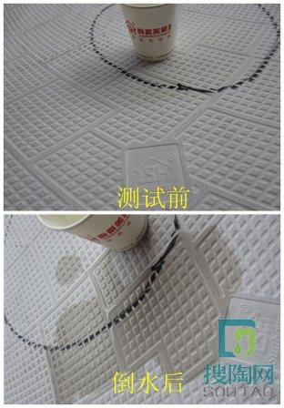 ★點評:測評員在“羅馬灰”磚體背面倒上白開水,水就往下流了,最開始以為這款產品的吸水率不怎樣,但是,觀察了一下,原來瓷磚放在傾斜的地方,不是平地而放,所以水才會往下流,中間部分還是可以看到水凝成水灘,所以,這“羅馬灰”的吸水率是非常低的,由此推測其內部的穩定性也就非常高。
