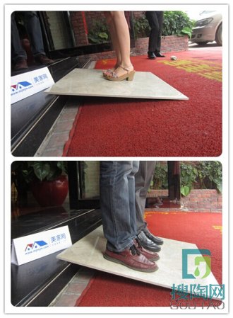 ●提示:將瓷磚放置在一個有高度的地方,讓瓷磚與地面形成一定的傾角,站在整塊磚的中間,看看是否很容易下滑。