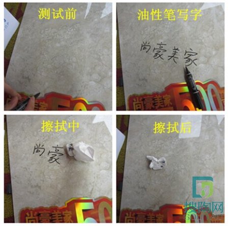 ★點評:測試員用黑色油性筆在“羅馬灰”釉面寫上“尚豪美家”。靜置5分鐘之后,用紙巾輕輕擦拭,還有痕跡,接著,再用力擦,就全部擦掉了。這款產品的防污性能確實很不錯。