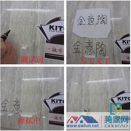 點評:測試員用黑色油性筆在“波西米亞”釉面寫上“金意陶”,對比紙上寫的“御家”顏色淺了很多。靜置5分鐘之后,用紙巾輕輕擦拭,擦掉一下,再用力擦,就全部擦掉了,“波西米亞的防污性能確實很不錯。