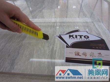點評:測評員用堅硬的工地專用刀試著刮了一下“波西米亞”釉面,很滑,再來回用力刮,也沒有見到刮痕,用手摸刮處,只是有一些細(xì)微的微塵,再擦拭一下,就又是光滑的了,由此可見金意陶的這款“波西米亞”耐磨度非常強(qiáng)。