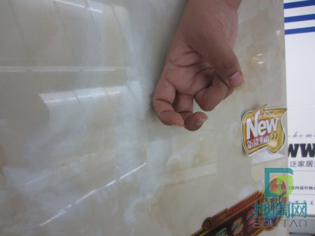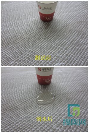 國家標準規定瓷磚為E≤0.5%的吸水率,陶質磚吸水率E>10% 。實際效果是將一杯150毫升的水倒在瓷磚背后,在3秒鐘后,如果水會全部滲入磚體,則說明瓷磚的吸水速度較快吸水率E>10%,那么也就說明瓷磚質量較差。評測員經過試驗,將水倒入該款瓷磚背面后,瓷磚表面的水珠依舊成型不擴散,無明顯滲透現象;用抹布將水抹去后,經過3分鐘,上面的水漬依舊清晰,證明該款瓷磚吸水率較低,質量較好。