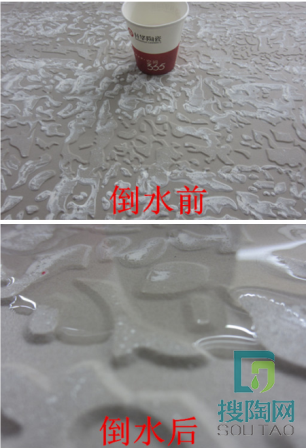 瓷磚的吸水率是衡量瓷磚的質量指標之一。一般來說,吸水率也決定了瓷磚的使用壽命。測評員經過試驗,將水倒入該款瓷磚背面后,水會跟著背部紋理流動,等靜置5分鐘后,上面的水跡依舊成型不,無明顯滲透現象,證明該款瓷磚吸水率較低,質量較好。