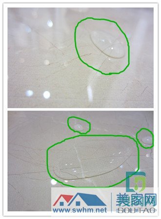 吸水率的大小是瓷磚質量的一個重要標志。將一小杯水倒在磚體的正面,水擴散得越快說明瓷磚表面質地越疏松,強度越弱,反之則反。
