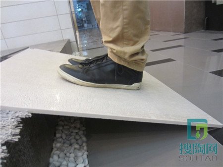 小編把評(píng)測(cè)瓷片斜放在階梯處,從而與地面成一定的斜面。讓現(xiàn)場(chǎng)工作人員(大約60kg)站上去,來(lái)回挪動(dòng)腳步。感覺(jué)平穩(wěn),承重性能不錯(cuò),質(zhì)地堅(jiān)硬、耐壓性能高。同時(shí),該款瓷磚表面紋理突出,質(zhì)感良好,防滑性可見(jiàn)一斑!