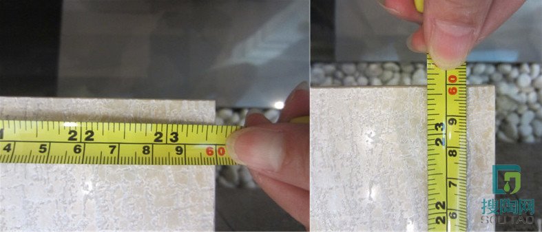 小編現(xiàn)場(chǎng)拿尺子測(cè)量了一下,長(zhǎng)度、寬度都為600mm,符合瓷片標(biāo)準(zhǔn)規(guī)格600mm*600mm,工藝上制作嚴(yán)格,尺寸精準(zhǔn)。