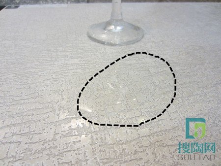 若干分鐘后,表面的水并無(wú)擴(kuò)散和滲透,也無(wú)變色,可見(jiàn)吸水率低,不易滲水。說(shuō)明該款瓷磚質(zhì)地密,品質(zhì)好。