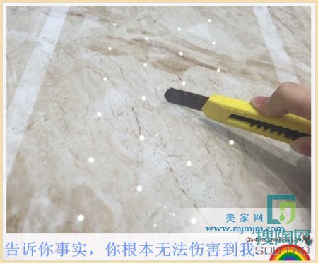 一般來說,燒制陶瓷的溫度越高,硬度愈大。格仕陶超平高清大理石瓷磚經受了1280°高溫歷時80分鐘煅燒,鑄就其的超高硬度。測評員使用鑰匙在瓷磚上用力劃過,瓷磚表面無任何劃痕,耐磨性非常好。這也從另一個角度說明瓷磚密度高,質量好。