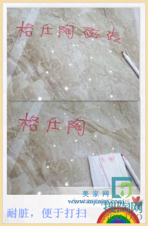 很多人認為污漬污垢在瓷磚表面是完全不會吸附的,其實這種觀點是錯誤的。瓷磚表面看著光滑,但密度和材質卻不盡相同,而且污漬一旦被瓷磚吸附,很有可能就成為永久的傷痕,無法清除。在現場我們用紅色水性筆在瓷磚表面寫字做測試。