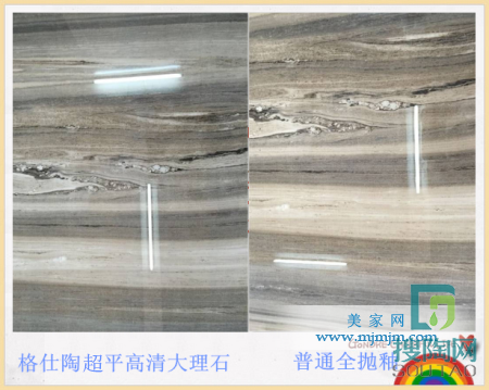 首先小編把兩塊瓷磚放在燈光下面做個對比,從圖中我們可以清楚的看到,格仕陶超平高清大理石的燈光影子不僅高清而且燈光影子是非常平整的,而普通的全拋釉卻顯得遜色了,燈光影子模糊不但還凹凸不平。可為何會出現這樣差異化的明顯對比呢,由小編來給大家揭開謎底。