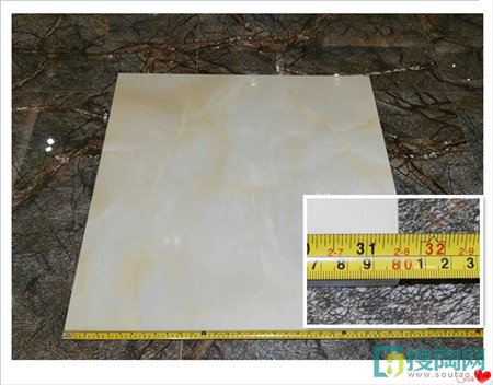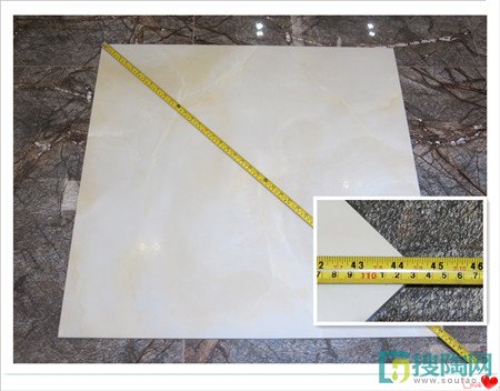 特地陶瓷的工作人員告訴小編這款羊脂玉石瓷磚規格為800*800mm,于是小編便用測量軟尺給這款瓷磚測量一下,經測量得出結果長寬為800mm,對角線約長1130mm,如同特地瓷磚工作人員所說的瓷磚規格一樣。