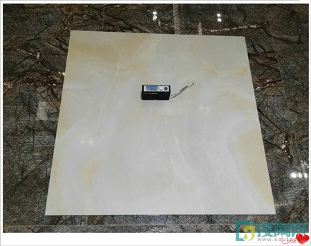 光度太強容易讓人產生視覺疲勞,光度太弱空間裝飾效果不佳,小編用光澤儀放在瓷磚表面的不同位置上得出的平均值,發現這款羊脂玉石瓷磚采用尖端蠟拋技術,光度適中,磚面質感溫潤柔和、光感細膩潤澤。
