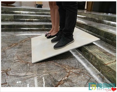 對于測試瓷磚的抗壓性如何,同樣我們把瓷磚傾斜放置,然后小編讓兩位工作人員站上去,發現傾斜的瓷磚在承受著兩位成年人的壓力之下,并沒有出現任何破裂的跡象,這說明了特地羊脂玉石瓷磚的抗壓性好,不易開裂。