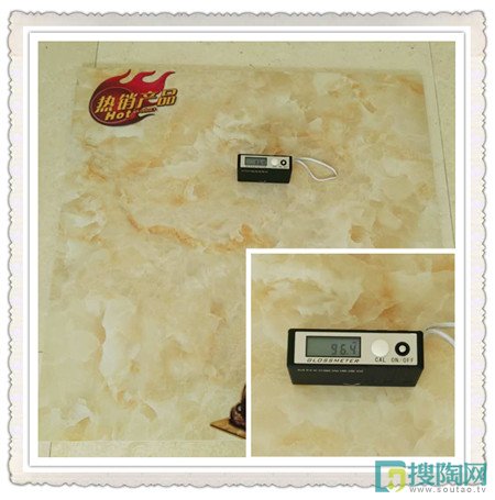光澤度好的瓷磚不僅防污性好,而且還會增大室內空間的視覺效果。小編用專業的光澤儀器分別在瓷磚表面不同的位置進行測量,最后得出了平均值竟可達到96.4之高的數值,這說明了此款瓷磚的光澤度非常好。